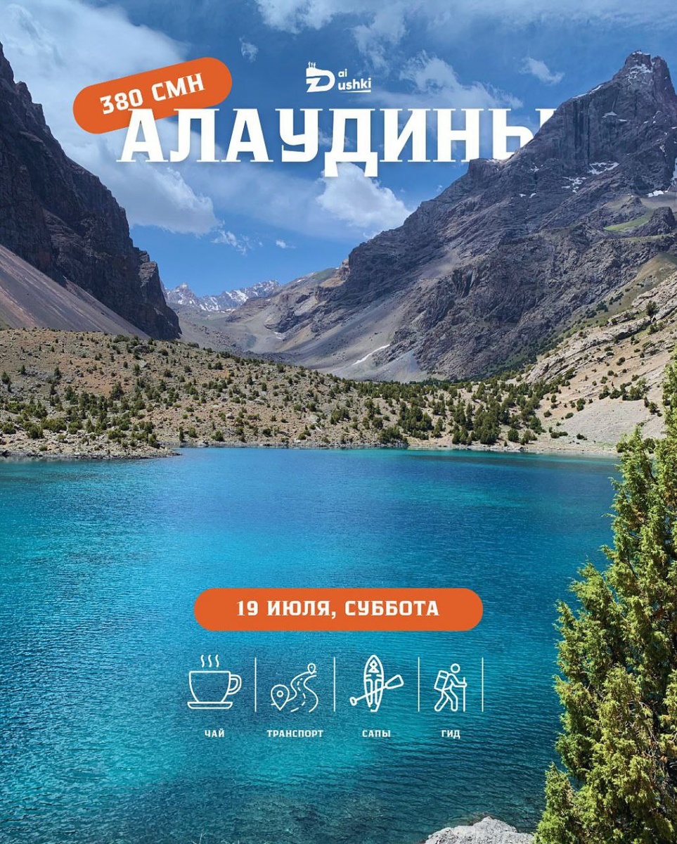 19 июля, сб, -Алаудинское озеро, катание на сапах 🕔 5:30 - 19:00 💺 ДОСТУПНО: 10 мест 🥾 Сложность: 4/10 💳 380 ✅ Включено: дорога, гид, горячий чай, сап ⚡️"Мальдивы и Швейцария в Таджикистане" - так некоторые гости и жители Таджикистана называют Алаудинские озера, к которым мы отправимся в эту субботу. Необыкновенный окрас озер от изумродного до бирюзового цветов делает эти озера необыкновенно красивыми. На фоне заснежанных пиков, одних из самых высоких в Фанских горах, среди которых пик Чимтарга, создает необыкновенный, даже немного внеземной ландшафт! Катаясь на сапах по Большому Алаудинскому озеру, глубина которого достигает около 16 м, кажется, что ты как будто паришь в воздухе на сапах, и некоторые испытывают легкое головокружение от кажущейся высоты, так как не смотря на глубину, видны даже самые маленькие камни на дне. Звучит, как сказка, а некотороые даже могут подумать, что преувеличенная реклама. Поехали с нами и ты увидишь, что то о чем мы написали здесь, не входит в срав