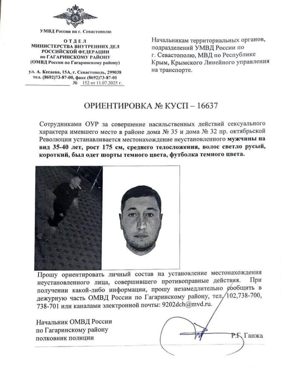 В ответ на пост 🔘Появилась ориентировка на севастопольского насильника: Ищут мужчину 35-40 лет, рост 175 см, среднего телосложения, светло-русые короткие волосы. В моменты преступлений был одет в темные шорты и футболку. Местонахождение неустановленного — район домов №35 и №32 по проспекту Октябрьской Революции. Ранее сообщалось о нападениях у парка Победы и на Героев Сталинграда. Приметы стали известны благодаря показаниям потерпевших и записям камер видеонаблюдения. Полиция просит жителей быть предельно осторожными, особенно женщин в ночное время. ⚠️Есть информация? Звоните: 102, 8(8692)738-700, 8(8692)738-701. И максимально распространите пост! Обновлено: данная ориентировка уже неактуальна, — сообщили в полиции Севастополя Также они сообщили, что информация о якобы многочисленных жертвах предполагаемого преступника не соответствует действительности. Изменились ли данные в ориентировке или преступника поймали — неизвестно. Ждем официальную информацию. 🔴Подписаться на Севас