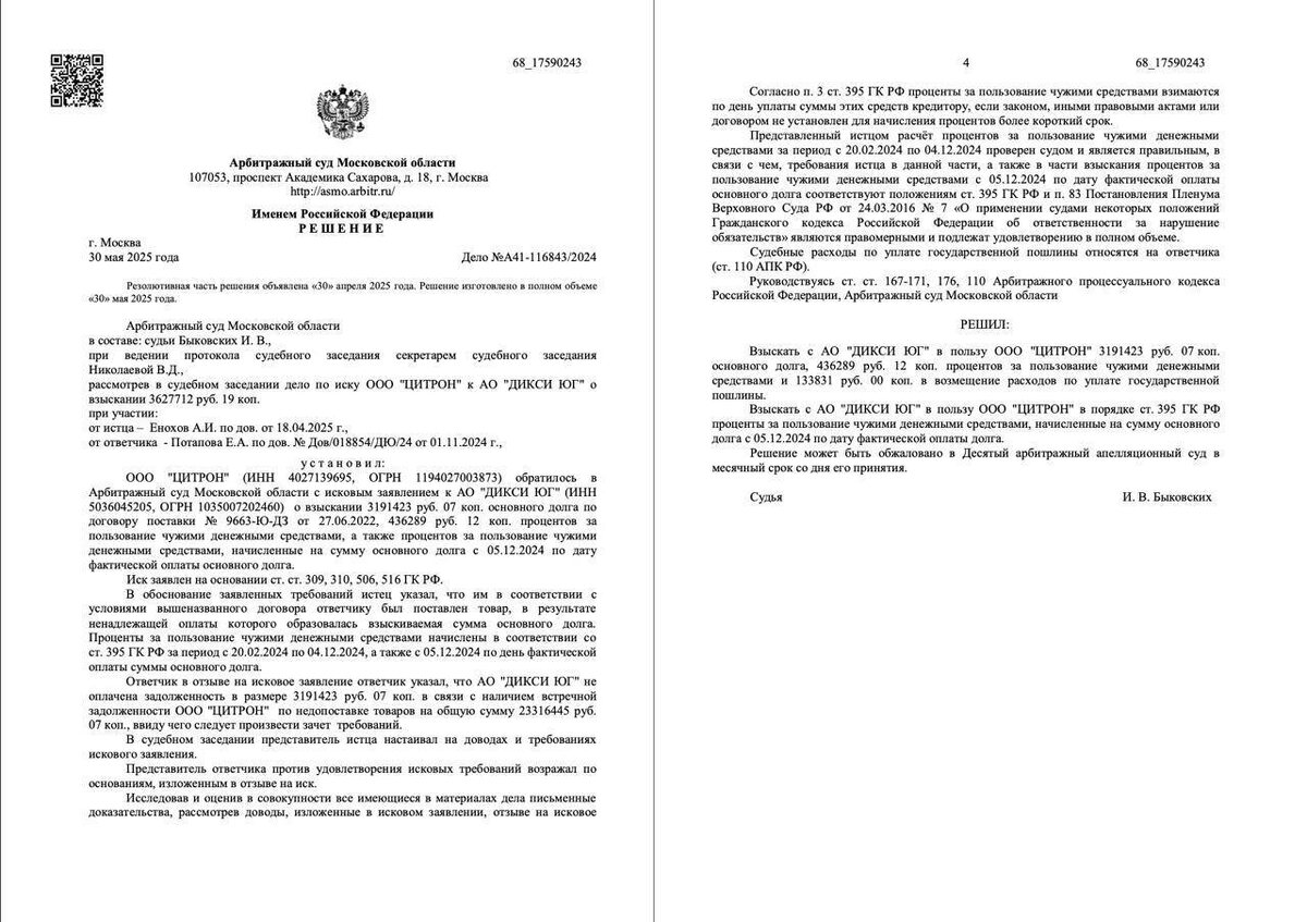 Наша компания одержала убедительную победу для ООО "ЦИТРОН" против АО "ДИКСИ ЮГ". Суд полностью удовлетворил иск, взыскав свыше 3,76 млн рублей (долг + проценты + госпошлина + текущие проценты). Судья отклонил доводы ответчика о встречной задолженности на 23 млн рублей, признав их несостоятельными для зачета. Права поставщика защищены в полном объеме.