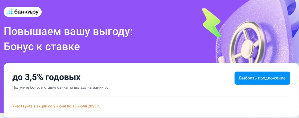 Аналитики уверены: на ближайшем заседании ЦБ РФ - 25 июля - ставка рефинансирования резко опустится сразу на 2 процентных пункта. Банки, похоже, тоже в этом уверены - и уже начали опускать ставки по вкладам. Вкладчики новости читают, снижение ставок видят - и уже спешат зафиксировать условия повыгоднее. Если вы из их числа - есть интересная акция. Известный финмаркетплейс "Банки ру" предлагает бонус + 3,5% к вкладу, открытому через эту платформу. Чтобы принять участие в акции, откройте личный кабинет на "Банки ру" и перейдите в раздел "Акции": Срок - 3 месяца. Сумма - от 10 000 до 50 000 000 руб. В акции участвуют 8 вкладов. Есть предложения на любой вкус - ставка от популярных банков (МКБ, Дом РФ) чуть пониже, от малоизвестных игроков чуть побольше: Примечание: осторожнее с вкладом под 19% годовых от МКБ! Там дополнительно нужно тратить по картам этого банка от 10 000 ₽ / мес. или купить подписку. Если не выполнять эти условия, ставка снижается до 17%. За счет бонуса +3,5% доходнос