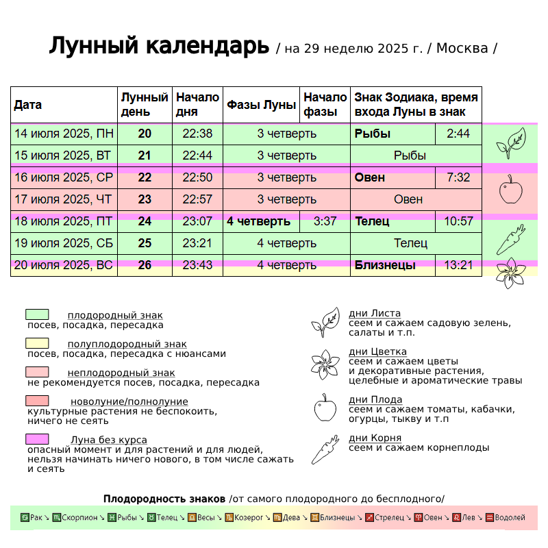 Ну наконец-то! Благоприятная неделя для работ с растениями, а то мои зелёные братья-сестры заждались) Но Луна без курса довольно много времени отъедает: Середина лета. Эпогей года. Лето – это маленькая жизнь (с). А в жизни цветовода наступает неотвратимая стадия борьбы. Борьбы с насекомыми и клещами). Мне в этом сезоне было лениво проводить профилактику, да и отравившийся под Новый год циперусом кот не подливал энтузазизму, и вроде как с трипсами-клещами пока пронесло, но вот грибные комарики одолели, вьются во всех горшках, достали. Пора начинать. И надо бы освежить знания) Рыбы – самый продуктивный знак Зодиака, обеспечивает обильный, но плохо сохраняемый урожай и на семенные цели не пригодный. Растения имеют хорошие корни, короткий стебель, вкусные плоды. При посеве и посадке в эти дни растения растут очень быстро (Овен — спринтер на короткие дистанции), но получаются слабыми, плохо завязывают плоды. Всходы появляются быстро, но урожай будет средним и плохо coхраняемым, а также непр