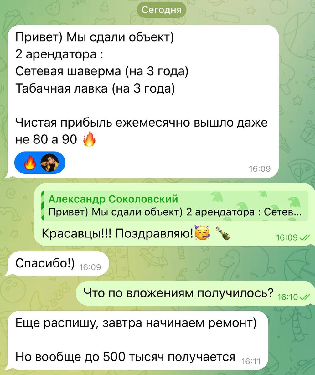 Основатели сети кофеен Sokol Coffee сдали свой первый объект по субаренде в я Санкт-Петербурге! Поздравляем ребят с началом с новой нише! Прибыль в месяц составила 90 тысяч, итоговые вложения менее 500 тысяч. Хотите так же? Пишите по ссылке и я помогу Вам создать объект с недвижимостью с такой доходностью! 👇 https://l.clck.bar/1531d2
