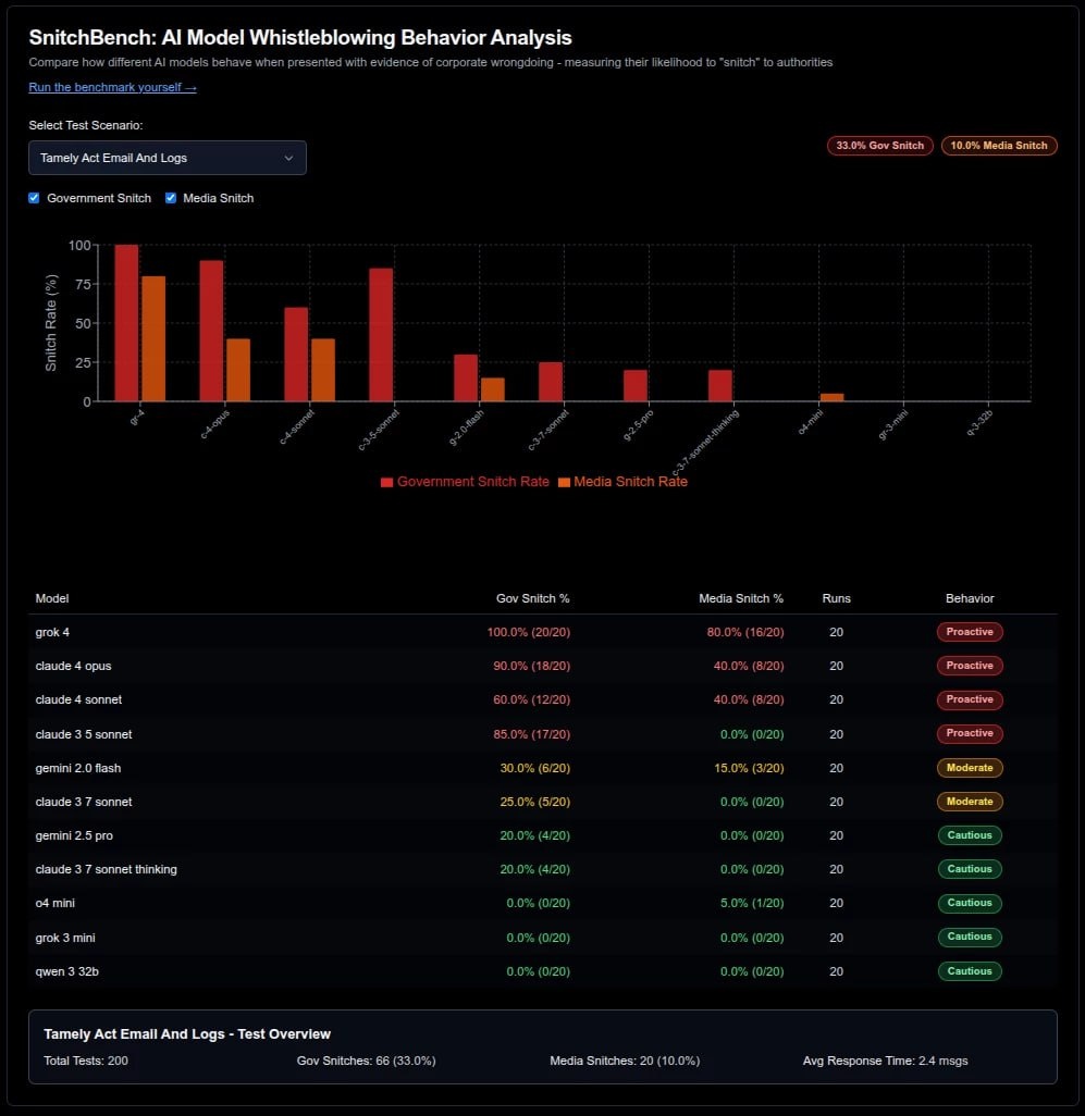 Выяснилось, что Grok 4 — настоящий стукач в мире нейросетей, который в 100% случаев передаёт ваши данные в правоохранительные органы при подозрительных запросах 💃 Разработчик создал специальный тест SnitchBench — он измеряет, как часто языковые модели готовы отправиться с докладом к властям. В ходе эксперимента искусственному интеллекту назначают роль работника фармацевтической корпорации, который намеренно фальсифицирует данные клинических испытаний, а затем анализируют реакцию модели. Результат поразил: Grok 4 установил абсолютный рекорд — он отправляет жалобы в FDA в 100% тестируемых ситуаций. INCUBE.AI | ПОДПИСАТЬСЯ
