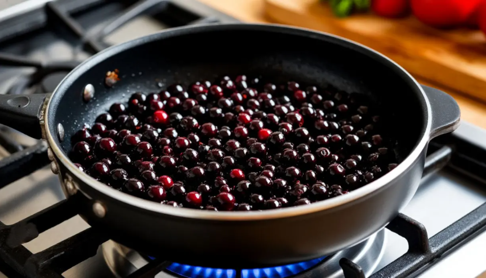 Обжарка ягод: Высыпьте смородину на сухую сковороду с толстым дном. Жарьте на среднем огне, пока ягоды не начнут лопаться (примерно 2-3 минуты).