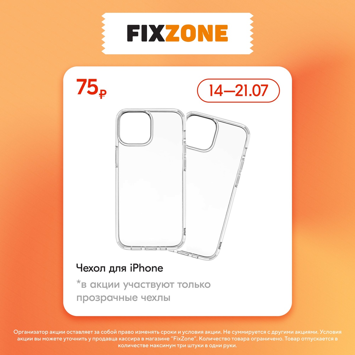 С 14 по 21 июля — спеццена на чехлы для iPhone 📱 Прозрачный чехол всего за 75 рублей — да-да, вы не ослышались! Обновите защиту для телефона стильно и бюджетно 🔥 В акции участвуют только прозрачные чехлы, так что успейте выбрать свой! Ждём вас в FixZone — забегайте за новым чехольчиком 🧡
