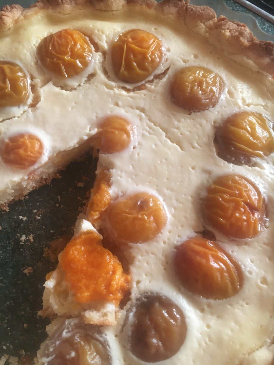 Кукурузный крахмал - 1 ст.л Абрикосы-4-5 штук. Масло берем размягченное, предварительно достав его из холодильника. В миске соединяем его с желтками и сахарной пудрой, перемешиваем до кремообразного состояния. Добавляем муку с разрыхлителем и быстро собираем тесто в шар. Раскатываем тесто между двумя листами бумаги – это удобно. Перекладываем его в форму, формируем бортики. Убираем форму с тестом в холодильник на 15-30 минут. Готовим заливку. Сметану, яйцо, сахар, крахмал и ванилин тщательно перемешиваем венчиком до однородности. И заливаем в охлажденную форму. Абрикосы моем, режем пополам, вынимаем косточки. Укладываем мякотью вниз прямо в заливку. Выпек