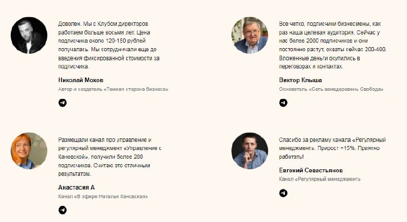 В ответ на пост "Мы получили 2000 подписчиков из Клуба директоров" (из отзыва) Друзья! В прошлом году я придумал программу по продвижению каналов наших участников. За это время мы набрали 7600 подписчиков в каналы (хоть и затянули, но работа движется!). За это время себестоимость выросла в 2 раза. Люди стали хуже подписываться в каналы. Вот эти ребята уже получили подписчиков: ➡️ Сеть авиадеревень Свобода @setaviaderevn +2000 подписчиков. У них 500-800 просмотров на пост ➡️Темная сторона бизнеса @DarkSideBusiness +1000 подписчиков и 700 просмотров на пост ➡️ Регулярный менеджмент @regularmanagement На старте сделали +15% подписчиков ➡️ В эфире Кановская @kanovskaya - привлекли +280 подписчиков из 446. Просмотров 100 на пост. Если сейчас вам гонят ботов или подписчик очень дорогой или не знаете, куда обратиться - читайте пост. Наша аудитория - это мы с вами. Такие люди и подписываются на канал. Но и молодые предприниматели, которые вчера закончили ВУЗ, а сегодня открыли шаурму/м