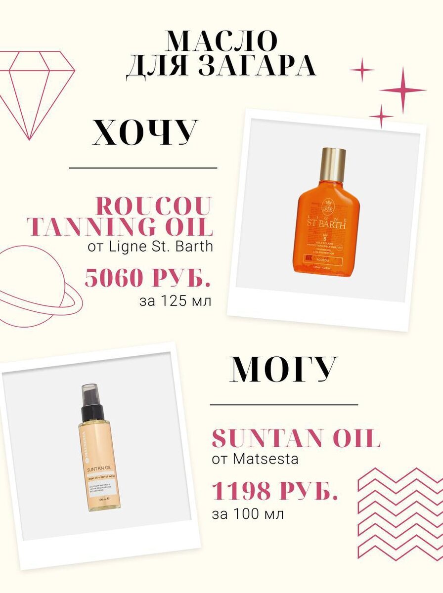 Любите ли вы масла для красивого ровного загара? Мой ответ: и да, и нет. Потому что на каждом масле (особенно моем любимце из раздела Хочу в сегодеяшнем выпуске) должен быть дисклеймер: «Не заменяет санскрин с высоким SPF, используйте в дополнение». Если это условие соблюдать, то эта пара масел — тот случай, когда хороши оба варианта, и демократичное, и премиальное. Не зря парочку подобрала одна моя очень капризная подруга. Тестируем и наслаждаемся☀️: Бренд Ligne St Barth берет начало на Сен-Бартелеми, небольшом острове на Карибском архипелаге. Здесь на роскошных виллах и частных яхтах родилась особая СПА-культура заботы о красоте и здоровье. А основатель Эрве Брин пытался передать этот французско-карибский образ жизни и его беззаботную роскошь в своей косметике. Хочу: Ligne St. Barth ROUCOU TANNING OIL — легендарное средство для загара содержит кокосовое масло и экстракт помадного дерева. Его традиционно используют в качестве солнцезащитного средства, которое стимулирует образование