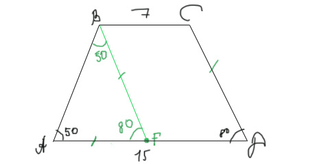 Углы A и D при основании трапеции ABCD равны 50∘ и 80∘ соответственно. Известно, что AD=15, BC=7. Найдите длину CD. Ответ 8 Угол C трапеции ABCD в два раза больше угла A, угол D равен 55∘. Найдите угол B трапеции. Достроим параллелограмм ВСДМ. В треугольнике ВАМ внешний угол М равен 2х, это сумма внутренних А и В, А равен х, значит и В тоже. 4х+110=360 х=62,5 Ответ 117,5 В трапеции ABCD угол A равен 43∘, угол D равен 94∘. Боковая сторона CD вдвое меньше основания AD. Чему равен угол ADB? Ответ 47 Каждая из диагоналей трапеции ABCD равна сумме оснований AD и BC. Найдите ∠ABD, если ∠BAD=70∘. Нужно использовать тот факт, что диагональ - это сумма оснований. Достраиваем параллелограмм ДВСМ, тогда АМ получится равной сумме оснований, как и АС, как и СМ, потому что СМ=ВД. АСМ вышел равносторонним. Теперь достраиваем ВСДН. Раз диагонали равны, трапеция равнобокая, значит углы при основании равны, а 2 других по 110. Но мы уже вычислили где у нас угол в 60 градусов, отмечаем такой же накрестлеж