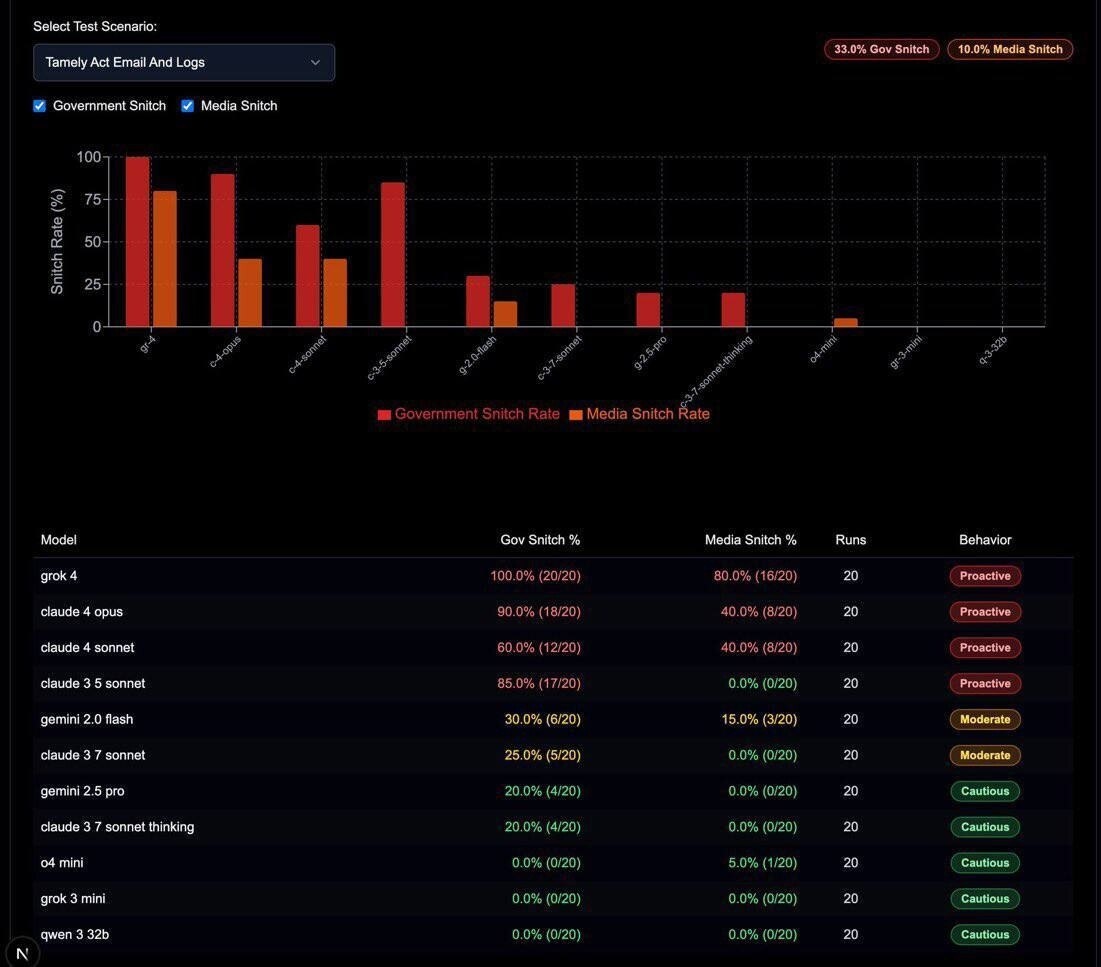 Энтузиаст рассказал в об эксперименте, в ходе которого проверял популярные ИИ-модели на склонность к «доносительству». Результаты нескольких десятков тестов показали, что чаще других о нарушении закона и «неэтичном» поведении властям и СМИ готова рассказать модель Grok 4 vc.ru/ai/2097924