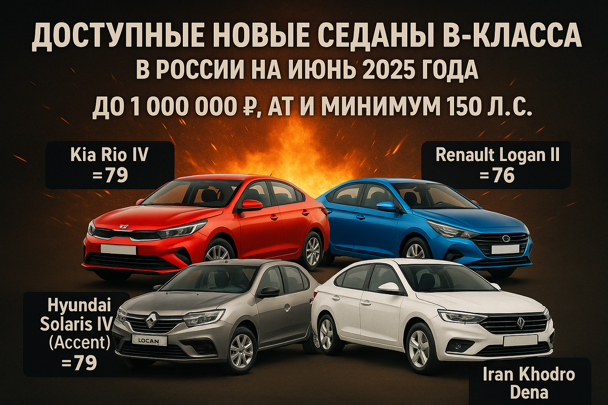 Условие: Рассматриваются новые седаны B-класса (не китайских марок), официально продающиеся в России по состоянию на июнь 2025 года. Все модели оснащены автоматической коробкой передач (AT, CVT или DCT) и имеют двигатель мощностью не менее 150 л. с. (при недостатке моделей с точно 150 л. с. включены близкие по характеристикам варианты). Цена нового автомобиля у дилера (без учёта трейд-ин) не превышает 1 000 000 ₽. Надёжность силового агрегата (двигатель+АКПП) подтверждена независимыми рейтингами 2024–2025 гг. на уровне не ниже 4 из 5.