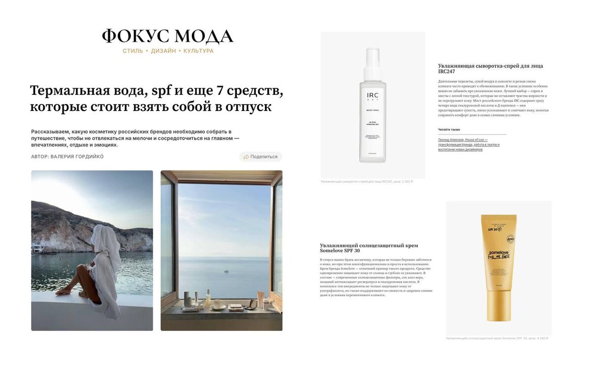 Косметичка в отпуск — это не просто набор средств, а мини-арсенал красоты, собранный с умом. Что взять с собой, чтобы сохранить сияние кожи в самолёте, защититься от солнца и не перегружать чемодан? В новом материале на «Фокус Мода» — список из 9 must-have продуктов от российских брендов: лёгкие мисты, универсальные SPF-кремы, очищающие пенки и travel-форматы, которые легко поместятся в ручную кладь и не подведут даже в тропиках. Подробности — в статье #ФокусМода_бьюти