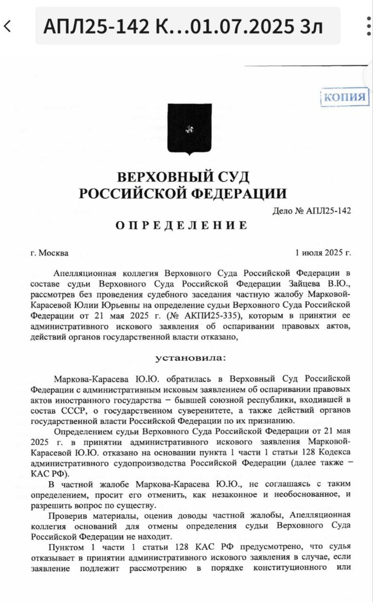 01.07.2025г судья Зайцев В.Ю. оставил без изменений решение судьи Бугакова О.А. - отказать в принятии административного искового заявления об отмене незаконных правовых актов приведших к разделу Советского Союза. Предательство Горбачева, который обязан был быть гарантом территориальной целостности и безопасности СССР, ошибка народа, не вставшего на защиту Отечества в 1991-ом и подписавшего себе смертный приговор в 1993-ем, выливаются в реки крови текущие из ран нашей многострадальной, разорванной на 15 частей Родины! Судьи своим отказом принимать иск к рассмотрению причиняют еще большие страдания тем, кто в условиях боевых действий прикрывает их мирную, сытую и неприкасаемую жизнь! Из-за отказа Верховного суда принять иск, американцы чувствуют себя в полной безопасности и безнаказанно снабжают Украину оружием и наемниками. Эскалация вражды по границам Российской Федерации нарастает... "Анаконда" сжимает кольцо... Ежедневные налёты беспилотников на города России и участившиеся