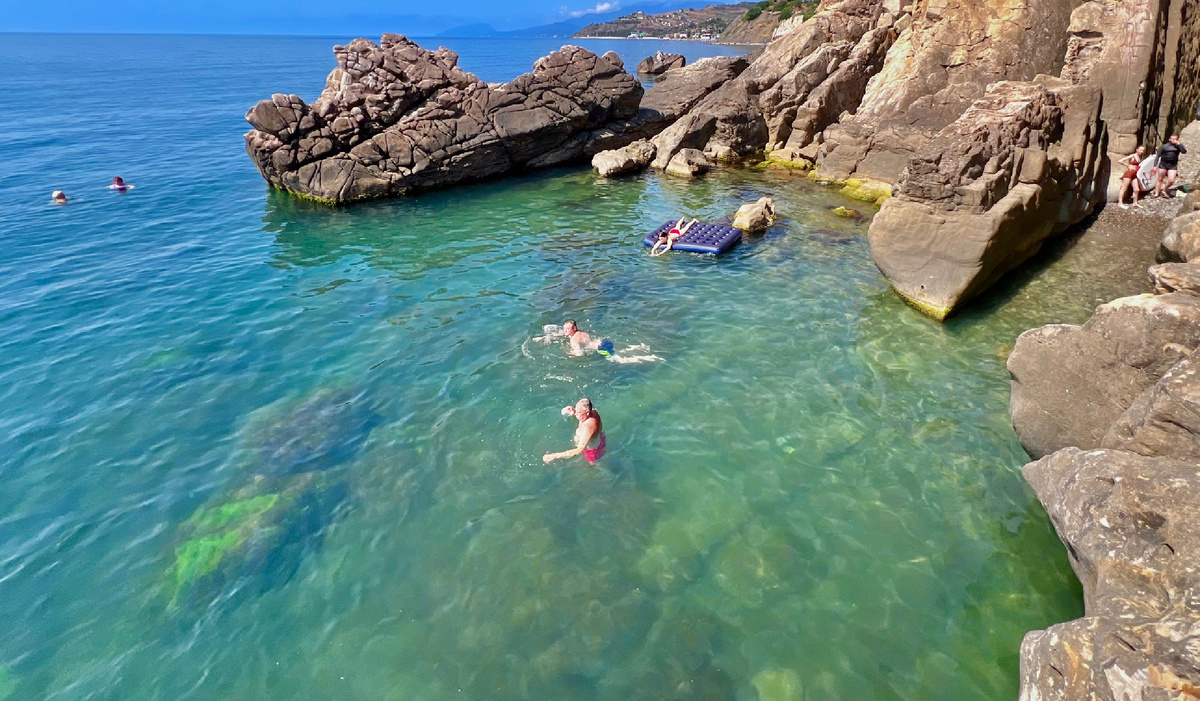 Купаться на многолюдном пляже, когда в вас есть свой сап-борд? Ни-за-что! Сегодня покажу вам простой маршрут с несколькими дикими крымскими пляжами. Да-да, в Крыму такие ещё остались! Причем возле таких популярных для морского отдыха поселков, как Рыбачье, Малореченское и Солнечногорское. Мы стартуем с утра пораньше с обычного городского пляжа в Солнышке — так ласково называют местные Солнечногорское. Двигаемся влево, на Восток. Уже через 20 — 30 минут покажутся скальные нагромождения возле села Малореченское. Нам туда. За камнями находим небольшую бухту. Высокая скальная стенка — это знаменитая «Сырная скала». Такое имя носит небольшой грот и обрыв из кварцитового песчаника. Выглядит весьма интересно! Ветра и волны столетиями выдували и вымывали эти ячейки — каверны. Они действительно напоминают дырки в сыре, что и послужило названием. Хотя более ранее название, известное с XVIII века — Скальный хаос Тузлух. «Тузлух» в переводе «солонка». Почему именно солонка? Вот это задачка на во