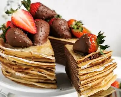 Блинный торт с шоколадным творогом выглядит красиво и элегантно на столе. Его можно украсить различными фруктами. Мой блинный торт - творог с шоколадом, сверху посыпанный сахарной пудрой и украшенный клубникой. Некоторые из них в шоколаде. Обязательно попробуйте приготовить.