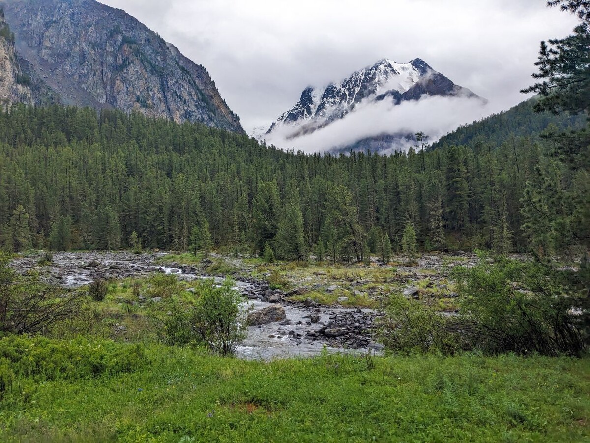 Погода не радовала. Было облачно. Утром дождь барабанил по палатке. Выползли, когда он закончился. Над горами, в сторону которых нам предстояло идти, висело огромное облако. В голову закрадывалась мысль, что, возможно, идти не стоит. В облаках мы все равно ничего не увидим. Сорокинское озеро находится на высоте примерно 2200 метров. И большая вероятность, что облака нас там и встретят. Но у нас был план, и мы решили его придерживаться. Собрали вещи, оставили их под крышей шалаша на случай дождя и отправились в путь. Первое, что нас ждало, — это брод. Но моему спутнику было лень разуваться, чтобы перейти в кроксах, и мы отправились на поиски камушков, по которым можно перепрыгать Шавлу. Река в этом месте довольно широкая, но разделена отмелями. Благодаря этому получается много небольших проток. На то, чтобы перейти большую часть, мы потратили час. После чего нам все равно пришлось переобуться в кроксы и идти вброд. К тому времени облака уже ушли в другом направлении. Погода радовал