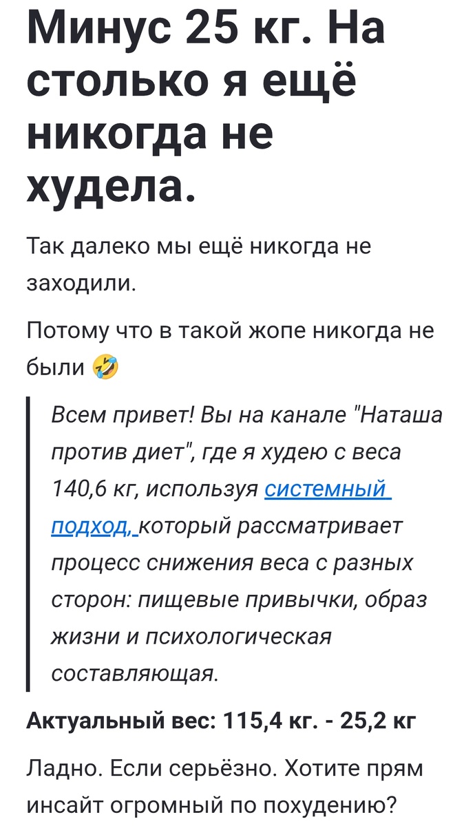 За много лет ведения блогов мои мысли сами часто складываются в посты и статьи. А при попадании в какую-то ситуацию я уже понимаю, как из этого сделать контент. Поэтому, когда в начале года я возобновила ведение социальных сетей, то первое время вообще не могла остановить поток текста, который выдавал мой мозг. Бывало, не могла уснуть ночью или наоборот, просыпалась от того, что статья "пишется прямо сейчас в голове" и это нужно срочно законспектировать. Мне о многом хотелось рассказать. У меня накопилось. Некоторые статьи или просто заголовки появлялись ещё до того, как это случится. Например, в моих черновиках несколько месяцев пролежала статья "Минус 25 кг. На столько я ещё никогда не худела". Сейчас я вам покажу отрывок. И вот со мной случились эти минус 25, но текст, который я написала тогда, больше не откликается мне. А сама идея рассказать об этом, как о грандиозном событии тоже стала не близка. Теперь я чувствую иначе. Когда я начала похудение и скинула несколько килогр
