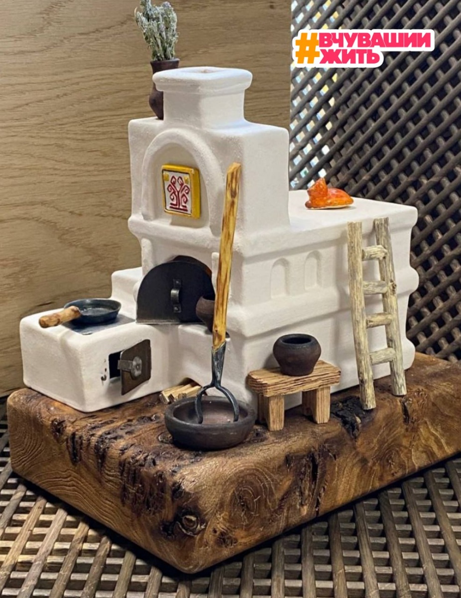 Печка с ладонь и с мельчайшими деталями – заслонка и сковородка, кочерга и лесенка, дрова и кошка...