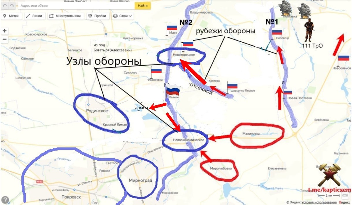 В ответ на пост Восточный охват Покровска. Начало оперативного прорыва (продолжение) После взятия Разино, ВС РФ продолжают разбирать рубеж №2. Официально освобожден Маяк, неофициально Федоровка и дорезают чубатых в Новоторецком. Так же зацепились на северных окраинах Новоэкономического. И блокировали дамбу. Вторая схема взята из конца 2024, где нарисовал основные зоны и узлы стратегической обороны ВСУ-сперто со стола одного из генштабов противоборствующих сторон. Пора новую тырить, эта уже почти все. Остался недобитый Покровский участок №4, и хорошо видно, что потеря н.п.Родинское для ВСУ фатально скажется на устойчивости обороны Покровска. Снабжать группировку из полтора десятка бригад через одну дорогу, которая под нашим арт и дронконтролем - нереально. К тому же, с большой долей вероятности, после взятия Родинское, активизируется левый фланг в районе Удачное-Коптево-Шевченко. Если никаких сюрпризов с обеих сторон не будет, то Генштаб Украины с потерей Родинское, начнет планомерный в