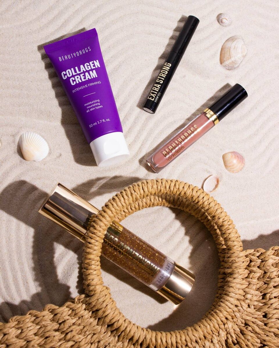 Добавляем в нее пять средств бренда: здесь и знаменитый гель с частичками золота для сияния и увлажнения кожи, и крем для лица с коллагеном моментального действия, и хрустящий мусс-пенка для тела, любимый плампер для губ и гель для бровей с эффектом ламинирования. Секрет продуктов в том, чтобы подарить глубокое увлажнение и питание коже, подчеркнуть ее загар и сияние, использовать минимум тона и добавить естественные лёгкие акценты в мейк.