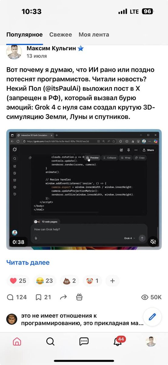 Вчера выложил вечером пост на VC.RU и он в топе. 50к просмотров. Не ожидал… Тема смотрю волнует. Бесплатные охваты, все как я люблю :) Вы еще не пишите туда? А зря, как видите... Да очевидно, что ИИ не заменит программистов, просто даст им подспорье в виде снижения рутинных действий - мы уже, например, верстку личных кабинетов делаем в chatGPT и т.п. Кто-то из ребят предпочитает DeepSeek... Русский ИТ бизнес