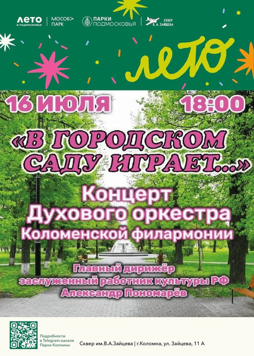 🎷✨ Друзья, готовьтесь к незабываемому вечеру! 16 июля в 18:00 в Сквере им. В.А. Зайцева состоится концерт Духового оркестра Коломенской филармонии под управлением Заслуженного работника культуры РФ Александра Пономарева. Программа «В городском саду...» включает в себя самые любимые и популярные произведения, которые заставят ваше сердце биться в такт с ритмом музыки. 🎶 Концерт состоится при благоприятных погодных условиях! ☀️ #ГородскойОкругКоломна #НашеПодмосковье #Московскаяобласть #Культмо #КультураКоломны #КультураОзёры #ПаркиПодмосковья #ПаркиКоломны #ПаркЗайцева #ЛетовПодмосковье #ЛетовКоломне #МосОблПарк #коломенскаяфилармония