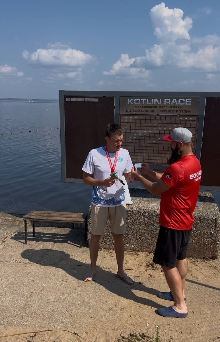 Марафонский заплыв KotlinRace 25 km от Санкт-Петербурга до острова Котлин. Сегодня было сразу две серии, протяженность каждой из которых по традиции с 2014 года всегда составляет 25 км. Серия 1. Я машина 14 июля в 5:20:26 Колычев Сергей стартовал от берега Елагина острова. Вода бодрящая, но солнце значительно подогревало как интерес, так и тело спортсмена. Мягко начал, вкатился и прошел максимально ровно всю дистанцию, затратив на всё про всё 7 часов 15 минут 34 секунды, и разместился на 11 строчке итогового протокола финишёров за всю историю марафона KotlinRace. Нельзя не процитировать слова Сергея: «Я планировал это сделать на 8 часов, но сделал – за 7:15. Поэтому я могу сказать, что я – машина!» Поздравляем героя Колычева Сергея этого неповторимого сериала под названием KotlinRace.