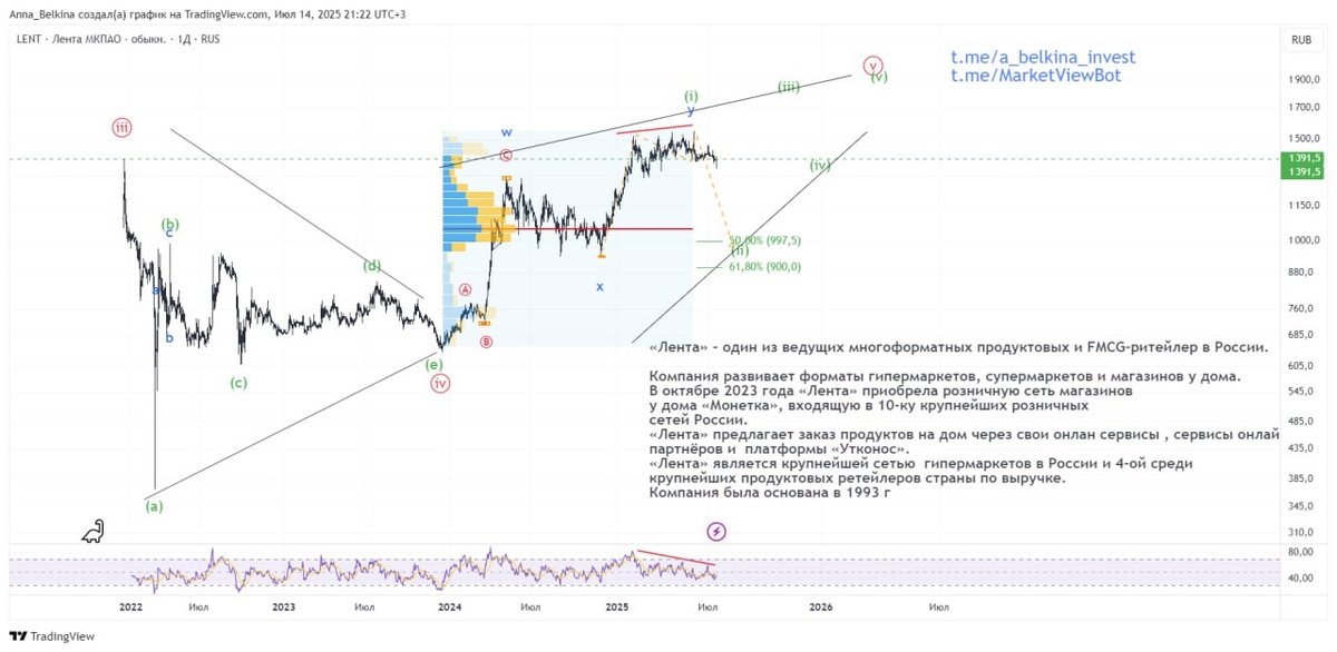#ПотребСектор_Нецикличные #LENT #ABRD #APTK Лента – о возможном падении отмечала ранее, т.к. здесь с февраля по июнь накапливалась перекупленность, а далее медвежья дивергенция. Т.о., открывается серьезный потенциал для снижения в бумаге. Абрау-Дюрсо – о состоянии индустрии виноделов в менее пьющей (по статистике) России рассуждали, когда анализировали Novabev Group #BELU. Абрау-Дюрсо также испытывает сложности, ко всему прочему бумага не столь ликвидная. В целом, идет отработка сценария со снижением по бумаге, для завершения структуры падения по основному сценарию не хватает как минимум еще 1 низа. Аптечная сеть 36.6 – третий эшелон, хорошо для добавления в портфель для диверсификации в периоды оптимизма на рынке, поскольку за довольно короткий срок бумаги «стреляют» на сотни процентов. Но сейчас не тот случай, плюс ко всему на бумаге не формируется импульса с низов, но тройки. Значит, это всего коррекционный отскок перед продолжением снижения. Не является ИИР 💪 Бот Закрытого