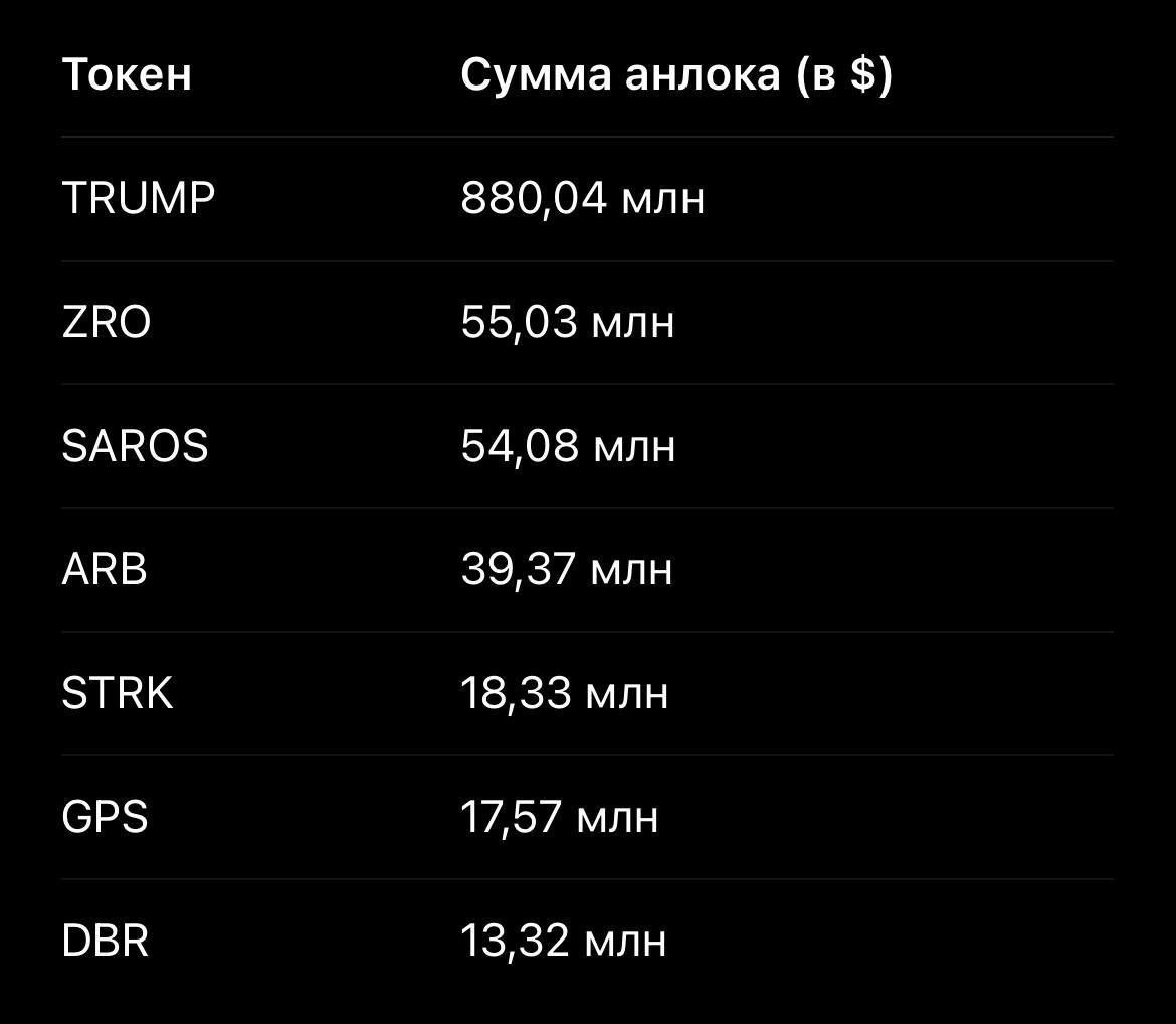 🔒 Главный анлок недели — мемкоин TRUMP на $1 млрд Уже на днях будет разблокировано почти $1 млрд в TRUMP, что составляет около 50% от текущей циркуляции токена. ⚠️ Это может вызвать сильную волатильность — как вниз, так и вверх, если будет скупка. 📉 Следим за движением китов и реакцией рынка.