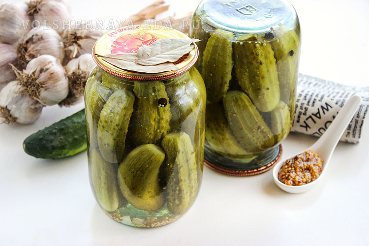 Зерна горчицы (готовая зернистая горчица, французская, дижонская) придают маринованным огурцам пикантность, легкую остроту и аромат. Сегодня будем готовить на зиму хрустящие маринованные огурцы в кисло-сладком маринаде, которые продаются в магазине, как корнишоны. Соотношение сахара и уксуса здесь высокое. Именно за счет таких пропорций получается «тот самый» узнаваемый вкус, огурчики получаются пряными и хрустящими. Совет! Если вы не сторонник использования большого количества уксуса и сахара в заготовках, то выберите другой рецепт: с томатной пастой, с кетчупом чили или с лимонной кислотой. Общее время: 3 часа | Время приготовления: 30 минут Выход: 3 л | Калорийность: 31.78 кКал на 100 г на банку 1 литр: Для маринада (хватит на 3 банки): Примечание. Удобнее всего закрывать огурцы в литровых банках. Маринада хватит для трех баночек по 1 литру каждая. Сахар и уксуса берем по 1 стакану, объем стакана = 200 мл. Огурцы для этого рецепта лучше выбрать некрупные. Их нужно помыть и замочить