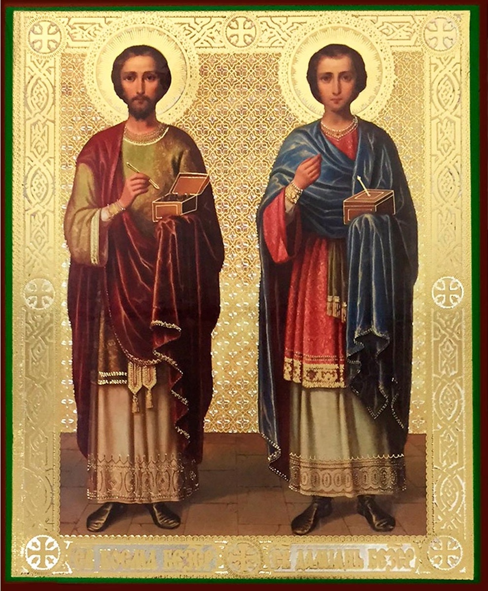 Святые мученики и бессребреники Косма и Дамиан родились в III веке в Риме и были воспитаны благочестивой христианкой-вдовой. Врачебное дело стало для братьев основой для благого дела — безвозмездного лечения больных. Они вместе приходили на помощь больным, лечили их и молились Богу так горячо и усердно, что многие больные после исцеления и проникновенной проповеди братьев о Христе и христианстве избирали их веру вместо язычества. Но и у них нашлись недоброжелатели, донесшие на них императору-язычнику Коринфу, который сразу же призвал их к ответу за проповедь христианства. Он потребовал, чтобы братья поклонились языческим богам и забыли своего Бога. Братья же ответили решительным отказом, обратились к Богу с молитвой о помощи, и она последовала мгновенно: неожиданно шея императора неестественно изогнулась, и ее постиг паралич. Тогда император сам взмолился с просьбой о помощи ко Христу, и Господь помиловал его и исцелил. В итоге он раскаялся, попросил прощения у братьев, отпустил их с м