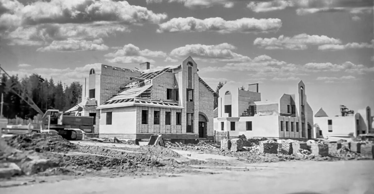 Улица Братьев Васнецовых в первой половине 1990-х только-только была образована рядом коттеджей, расположившихся между дорогой из бетонных плит и узкоколейной железной дорогой. На снимок как раз попало их строительство. Кстати, адресом с упоминанием этой улицы может похвастаться только шесть многоквартирных домов, два из которых возводились уже в новейшей истории.