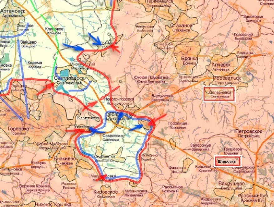 Прошу обратить внимание: на карте «Дебальцевского котла» 2015 года красными квадратиками восточнее Дебальцево мы отметили маленькие посёлки городского типа – два - из многочисленных фактически - пригородов этого важнейшего транспортного узла Донбасса (п.г.т. Селезнёвка и п.г.т. Штеровка)…