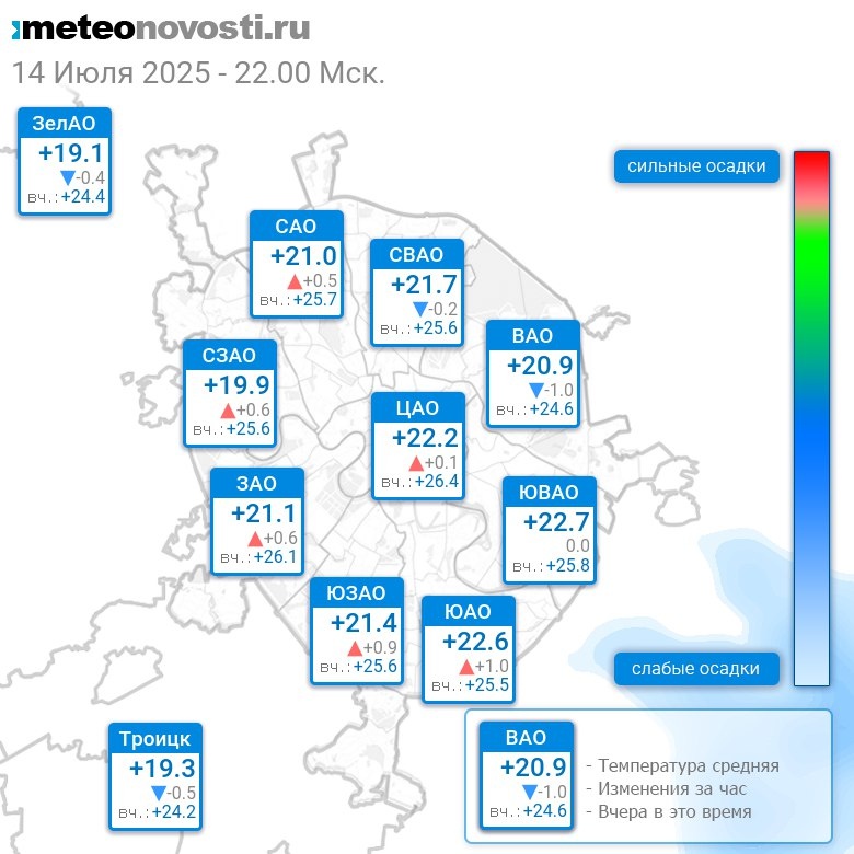 В 22:00 в Москве было от +17.6°C до +23.1°C, средняя температура +21.1°C #погода #Москва #лето #температура #14июля #понедельник