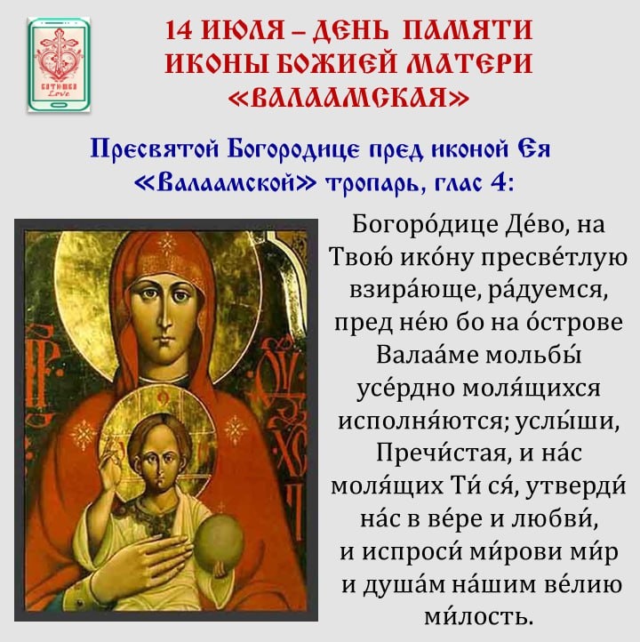 Икона, написанная в 1878 году валаамским иконописцем Алипием, по неизвестным причинам около двадцати лет пролежала в монастырской кладовой церкви святителя Николая. Обрели икону в 1897 году. При этом исцелилась от застарелой болезни ног паломница Наталья Андреева, которой Божия Матерь явилась накануне. До 1940 года икона оставалась на Валааме. С приходом на остров советской власти, монахи, перебравшиеся в Финляндию и основавшие там «Новый Валаам», забрали её с собой, и этот чудотворный образ до настоящего времени является главной святыней Преображенского собора Ново-Валаамского монастыря. На старом же Валааме остался список иконы, которая находилась прежде в Петербурге на Валаамском подворье. В 2000г Святейший Патриарх Московский и всея Руси Алексий II благословил строительство первого храма в честь Валаамской иконы Божией Матери, причём в том месте, где она была обретена. Храм в честь Валаамской иконы Пресвятой Богородицы был освящён 19.02.2005г года.