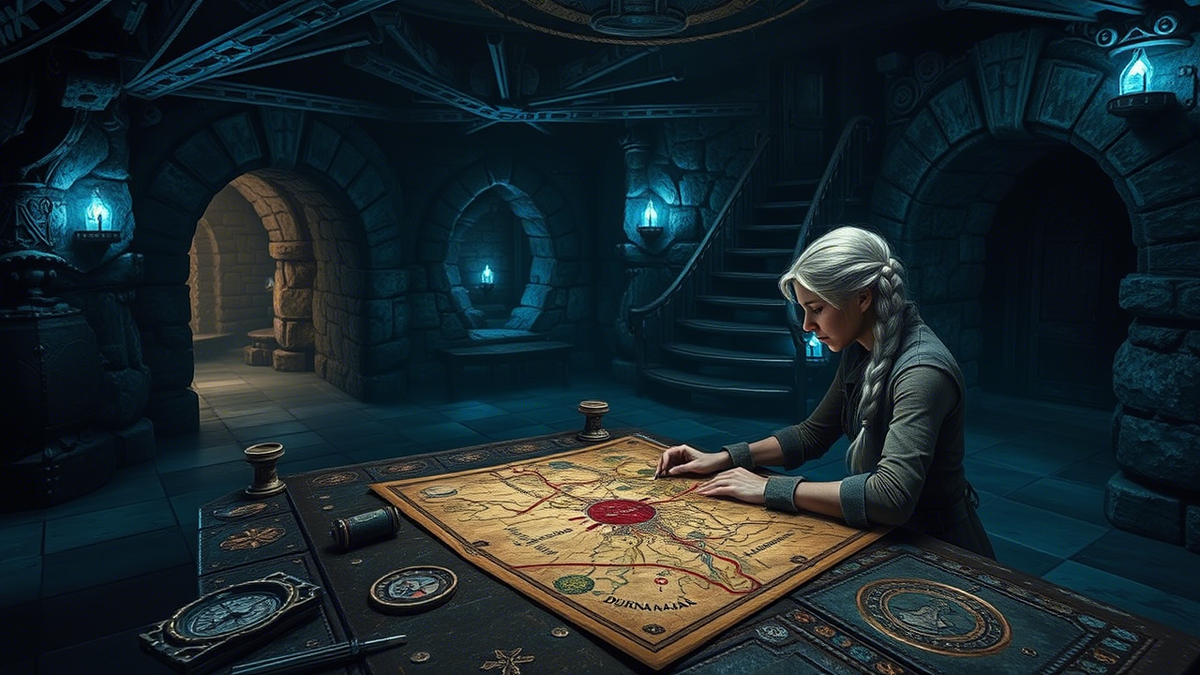 Ариэль сидела у низкого стола, освещённого мягким голубоватым светом кристаллов, встроенных в стены. Перед ней лежал раскрытый свиток с картой южных территорий, с отметками гарнизонов, шахт и давно заброшенных подземных путей. На краю — чёткий круг, обведённый красным пером: Дюрнакар.