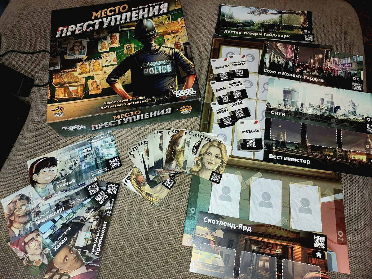 В «Месте преступления» ситуация совсем другая. Компоненты здесь – это тоже практически сплошные колоды карт: портреты участников событий и различные улики, а также большие планшеты локаций. Каждый компонент содержит qr-код. Электронное приложение нужно именно для того, чтобы сканировать эти коды и с их помощью совершать различные действия: перемещаться между локациями, говорить с очевидцами, исследовать улики.