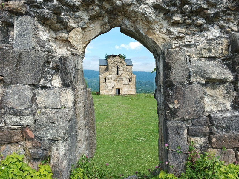 Часть 9: https://dzen.ru/a/aG6eG7OhNn7V7mRo?share_to=link 12.05.25. Из полузаброшенного Ткуарчала поехали к полузаброшенному Бедийскому храму. Дорога грунтовая местами с остатками асфальта. Сплошные ямы, заполненные водой. Неожиданно крепкая подвеска «Сhangan Alsvin» позволяет иногда ехать километров 30 в час. Часа через полтора шлепанья по ухабам и лужам добрались до цели. Последние несколько километров каменистая и колеистая дорога идёт в гору. Был здесь в 2012 году. Тогда я ещё не пользовался навигаторами, и путь к церкви определил безошибочно. На сей раз шайтан-компас, выбирая кратчайший путь, завёл нас к неподъёмному подъёму. С большим трудом, чтобы не повредить арендованное транспортное средство, развернулся на узкой горной тропе и, отключив гаджет, вернулся на путь истинный. Бедийский храм уже вторую тысячу лет фотогенично стоит на небольшом плато на фоне гор. Собор построен в Х веке абхазским царём Багратом II. Позже этот же самый Баграт II стал грузинским царём Багратом III. П