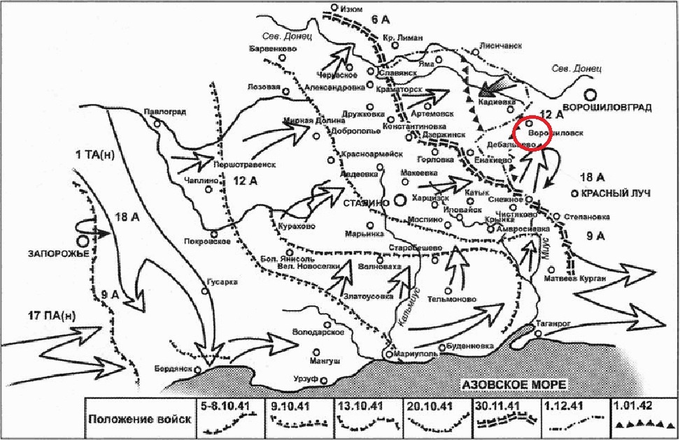 Комментарии к расшифрованному списку захороненных Героев Битвы за Донбасс (1941-1943 г.г.). Мемориал Братская могила г. Красный Луч, п.г.т. Штеровка, центральный парк. Волонтёр Проекта «Белые Журавли», историк Алексей Макаров Именно, исходя из вышеизложенной предыстории, мы и можно сделать вывод, что в мемориальных списках похороненных в Штеровке Героев – «как в капле воды» отражена вся трагическая и героическая история Битвы за Донбасс на всем её трехлетнем протяжении осени 1941 года – сентября 1943 года. В братской могиле под Мемориалом захоронены перенесённые из окрестностей Герои, павшие в сражениях, когда осенью 1941 года немцы вторглись на Донбасс, после уничтожения «Киевского котла» к 26 сентября 1941 года. На приложенной карте приблизительное месторасположение п.г.т. Штеровка обозначено красным кружком. Как можно понять, в Штеровке в конце 1941 – начале 1942 г.г. располагались ряд тыловых подразделений 18 Армии, оборонявшей подступы к важному транспортному узлу - Дебальцево. Р