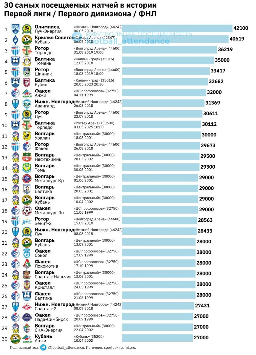 Уверен, этот рейтинг ждали многие из вас! После списка самых посещаемых матчей в истории РПЛ посмотрим на топ подэлитного дивизиона за всю российскую историю. Турнир назывался Первая лига (1992 - 1997, 2022/23 - н. в.), Первый дивизион (1996-2010), ФНЛ (2011/12 - 2021/22). Поэтому рассматриваю тут все эти вариации одного и того же. Самым посещаемым матчем в истории, наверное, ещё долгое время является игра «Олимпиец» – «Луч-Энергия», состоявшаяся 6 мая 2018 г. при 42100 зрителей. Это был один из тестовых матчей в Нижнем Новгороде перед ЧМ. Эту и другую интересную инфографику о посещаемости сморите в канале «Футбольная посещаемость». На второй позиции подобная игра в тот же день, но уже в Самаре между «Крыльями Советов» и «Кубанью» (40619). Кстати, обе встречи из топ-2 были в рамках одного 37-го тура ФНЛ-2017/18, собравшего в среднем 9812 зр./матч. Тройку замыкает игра «Ротора» и «Торпедо» (36219) в августе 2019-го. На 7-м месте игра «Факела» и «Анжи» из 1999-го (32000) – это лучшее зна