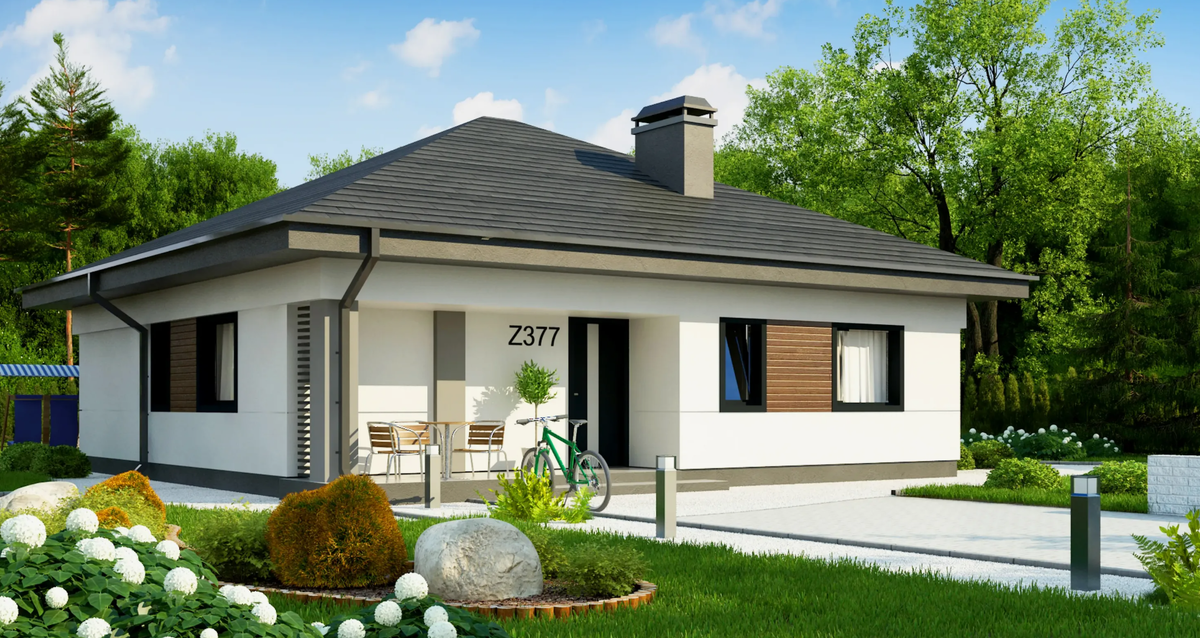 Дом площадью 100 кв. м, размеры 10 м × 10 м, с террасой 10 кв. м. Одноэтажный, с тремя спальнями, кухней-гостиной, ванной и прихожей. Кровля — двускатная, угол наклона 30°, высота конька 3 м. Окна большие, энергоэффективные, с видом на сад. Фасад простой и уютный, с теплой штукатуркой и зеленой крышей.