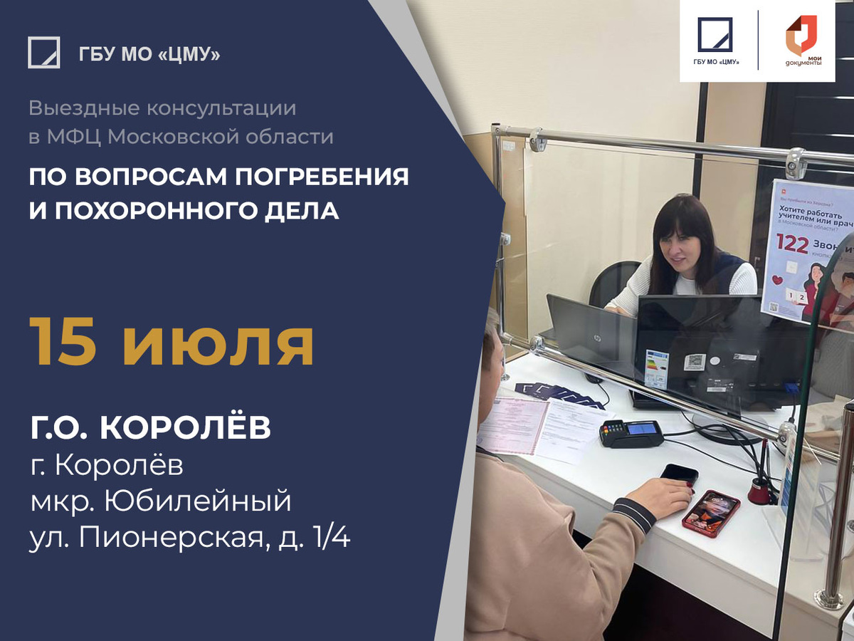 Бесплатные консультации от специалистов ГБУ МО «Центр мемориальных услуг» по вопросам погребения и похоронного дела в МФЦ вашего города Спешите получить консультацию в МФЦ вашего города, согласно графику выездов, от специалистов ГБУ МО «Центр мемориальных услуг». Если вы хотите узнать о законодательстве в сфере погребения и похоронного дела - приходите в МФЦ на консультацию. Наши специалисты ответят на все интересующие вас вопросы. 15.07.2025 - МФЦ, Московская обл., г.о. Королёв, г. Королёв, мкр. Юбилейный, ул. Пионерская, д. ¼ Также получить бесплатную консультацию в сфере погребения и похоронного дела можно удаленно, обратившись на круглосуточную горячую линию