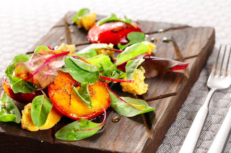 - Салат с рукколой, персиками и козьим сыром.