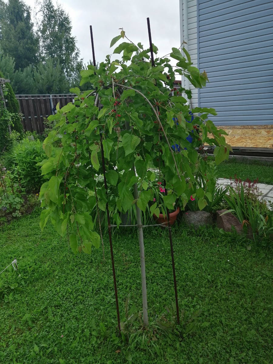 Шелковица появилась в моем саду три года назад. Да не простая, а штамбовая. Какого сорта, на чем привита - не знаю, так как она приобретена не мной лично, а подарил мне ее один очень хороший человек. Шелковица, или тутовое дерево для меня всегда воспоминания о детстве. А детство частично прошло в одной из бывших республик СССР. Рядом с домом моей тети прямо на улице росла огромная шелковица. Мы, дети, очень любили лакомится ее ягодами, хотя руки становились темно-синими, как после черники. А уж если ягода случайно попадала на одежду - пощады от старших не жди, пятна выводились с трудом. Еще помню кляксы от упавших ягод на асфальте и немой вопрос от нас, северян - как же можно, такое количество ягод пропало! Итак, в моей Растительной жизни появилась шелковица на штамбе. В первый же год после посадки она дала несколько ягод. О, какой был блаженный вкус у них! Каковы же принципы ухода за шелковицей на севере средней полосы России, то есть в Ярославской области. Первое и главное - это з