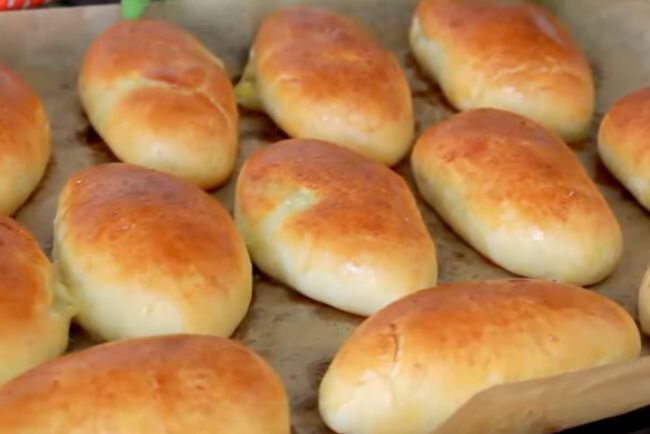 5. Выпекайте в горячей духовке при 180 градусах, примерно полчаса. Еще горячими их можно смазать сливочным маслом, корочка будет красиво блестеть и будет исходить от пирожков приятный запах.
