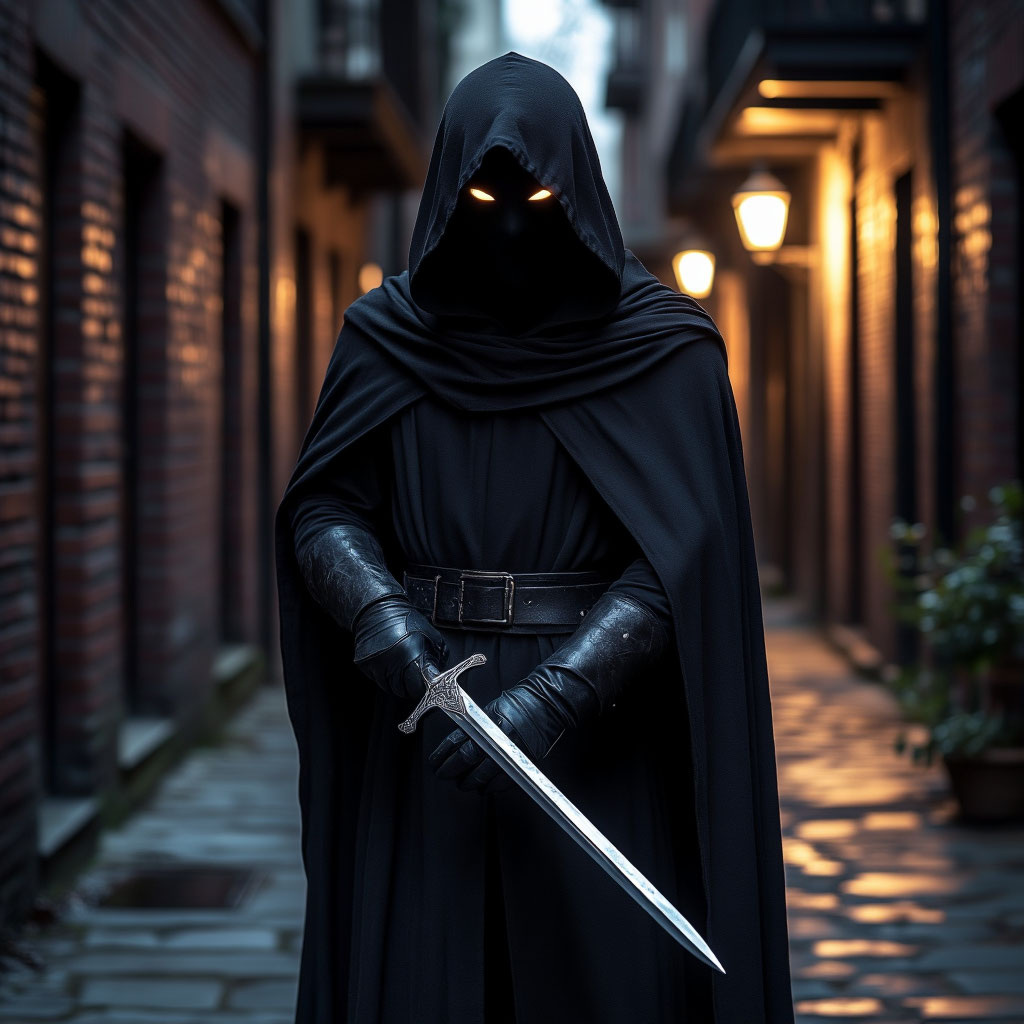 Она распахнула дверь, и там стоял он — худощавый мужчина в чёрном плаще с капюшоном, с лицом, превратившимся в неузнаваемую маску из засохшей крови, с обсидиановым ножом в бледном кулаке.