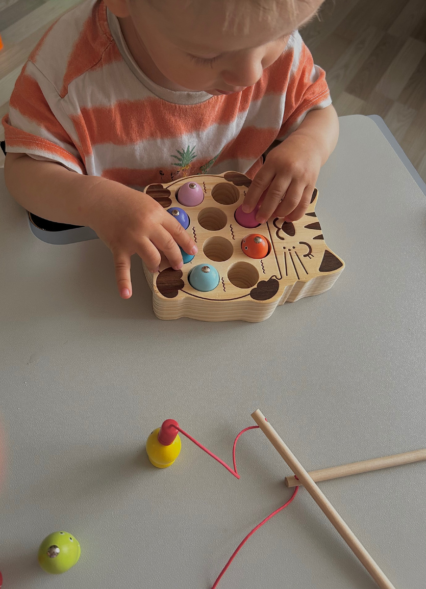 В настоящее время на рынке представлено большое разнообразие игрушек, имитирующих рыбалку с использованием магнитов. Мне особенно приглянулся этот вариант, поскольку его основа выполнена из дерева и имеет значительный вес. Эта игрушка позволяет не только ловить рыбу, как и положено, но и играть с рыбаком в обратном порядке. Ребёнок может пытаться поймать рыбку, тянуться за удочкой, тем самым полностью раскрывая ладонь, вот вам и CIMT-терапия. Влад усердно пытается поймать рыбок и положить их на стол. Пока у него не получается играть в традиционную рыбалку, но интерес уже есть👍 С уважением, ваш Автор