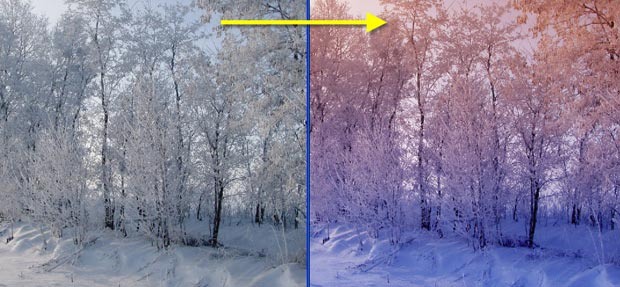 Возьмём за исходное изображение вот такой зимний пейзаж. Сделаем эффект заката солнца в фотошопе. В палитре "Слои" щёлкнем по средней иконке и в раскрывшемся списке выберем корректирующий слой "Градиент". Появится окно "Градиентная заливка", в котором мы никаких параметров не меняем, а просто нажмём "Да". Режим наложения для верхнего слоя установим на "Мягкий свет". Так же могут подойти и другие контрастные режимы. Установка режима наложения на данном этапе позволит нам наблюдать за сменой картинки в реальном режиме при замене градиентов, что значительно облегчит нашу задачу. Вот так сейчас выглядит зимний пейзаж после применения градиентной заливки, установленной по умолчанию. Два раза левой кнопкой мыши щёлкаем по иконке корректирующего слоя. Опять открывается окно "Градиентная заливка". Щёлкаем по чёрной стрелочке, направленной вниз правее поля "Градиент". Раскроется список градиентов, активных в данных момент. Щёлкаем по чёрной стрелочке левее кнопочки "Отмена". Раскроется длинный