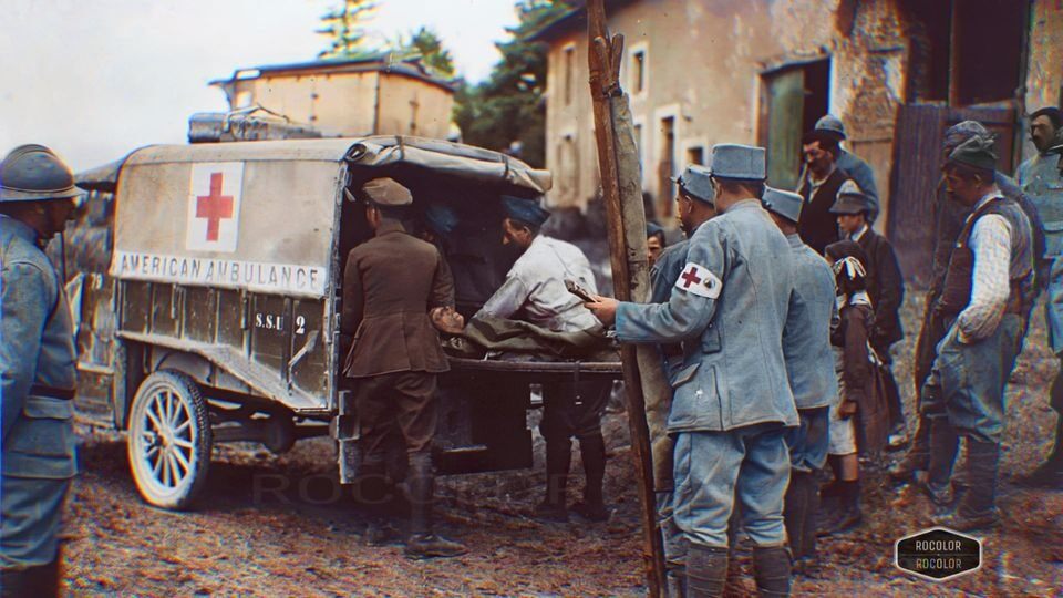 Американские медики эвакуирует раненых во французском городе Рекур-ле-Крё, недалеко от Вердена, 15 июля 1916 года.
