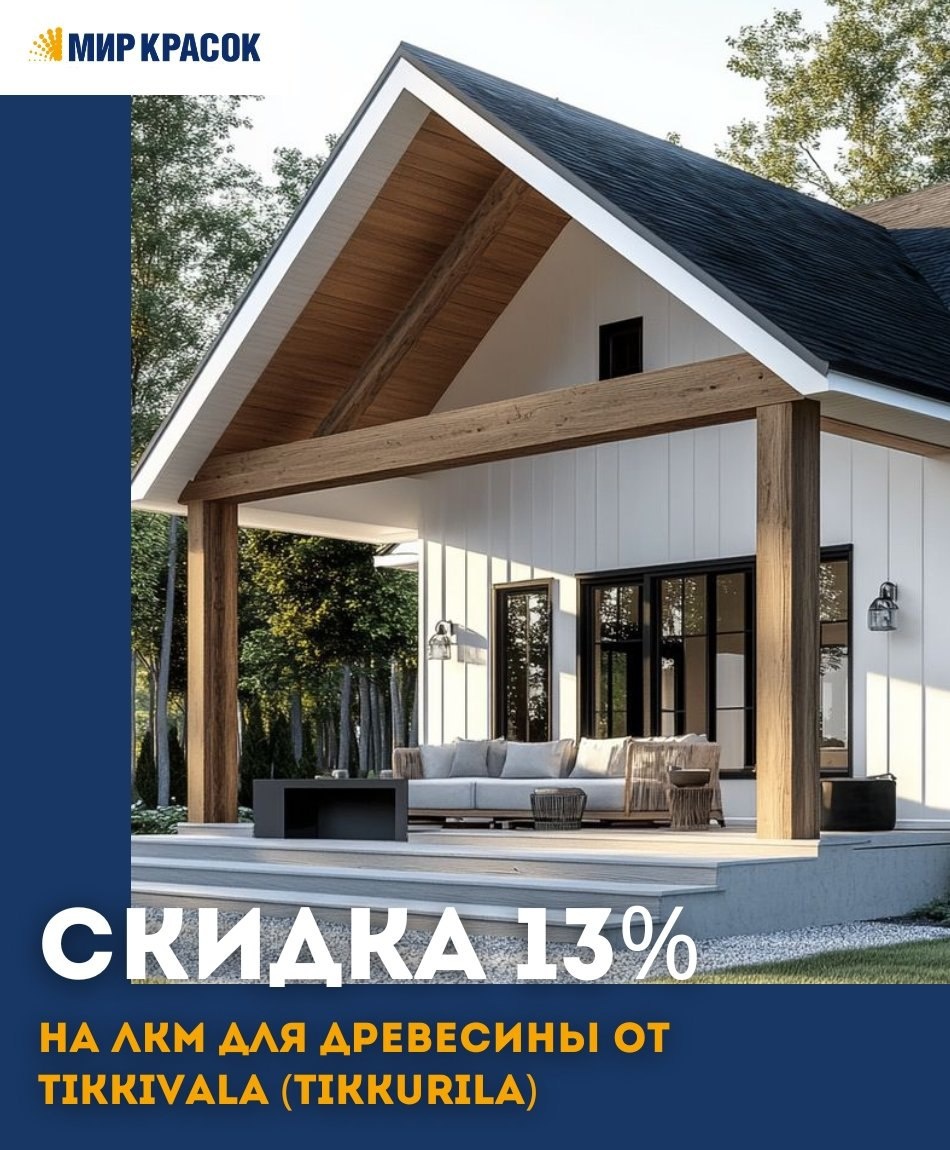В магазинах Мир Красок действует скидка 13% на проверенные временем продукты для деревянных фасадов от бренда Tikkivala (Tikkurila). Это надёжные, атмосферостойкие покрытия, которые: